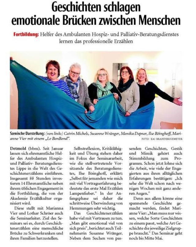 Ehrenamtliche des Ambulanten Hospiz- und Palliativ-Beratungsdienstes Lippe e. V. nehmen an einer Fortbildung der Akademie Erzählkultur teil, um mit professionell erzählten Geschichten emotionale Brücken zwischen den Menschen zu schlagen.